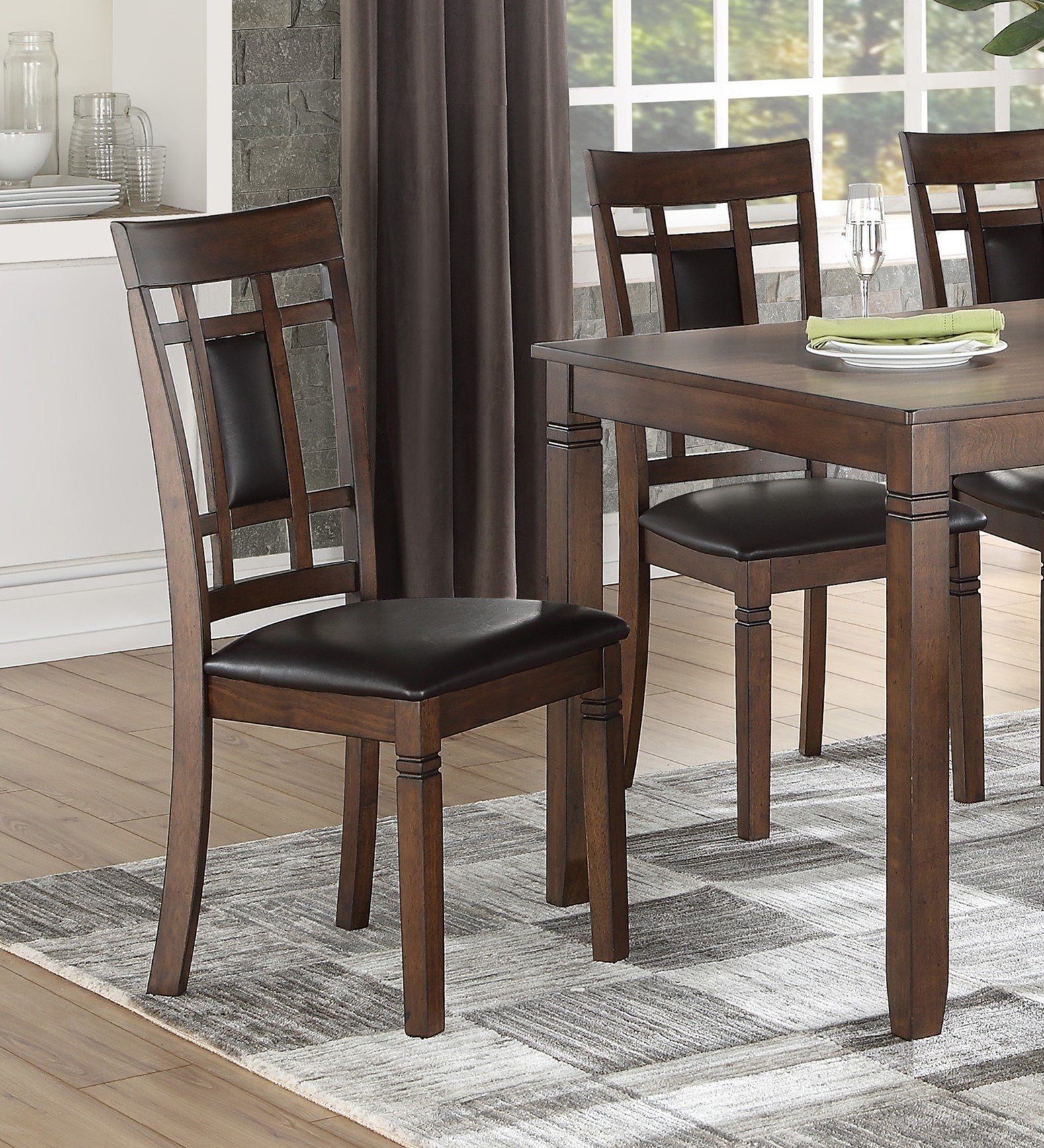 Designed for your casual dining space with a transitional look that draws inspiration from Arts & Crafts styling, the Salton Collection is packaged as a 6 piece set that includes the table, 4 chairs and a bench. The collection's birch veneer is finished in traditional cherry, lending to the timeless aesthetic. Wood framed chairs further draw inspiration from the classic style with brown faux leather seats and back accent providing complementing contrast to the finish.PRODUCT DIMENSIONS: TABLE: 36" x 60.5" x 30.5"H,Apron to floor: 27"Distance between legs from the shorter side: 30"Distance between legs from the longer side: 54.5"CHAIR: 18" x 22" x 38.5"HChair Seat: 18"W x 17"D x 18.5"HBENCH: 38.5" x 15.5" x 19"HBench seat: 38.5"W x 15.5"D x 19"HListing Includes: 6pc Dining Set (1 Dining Table, 1 Bench and 4 Side Chairs) Only.Simple Assembly Require