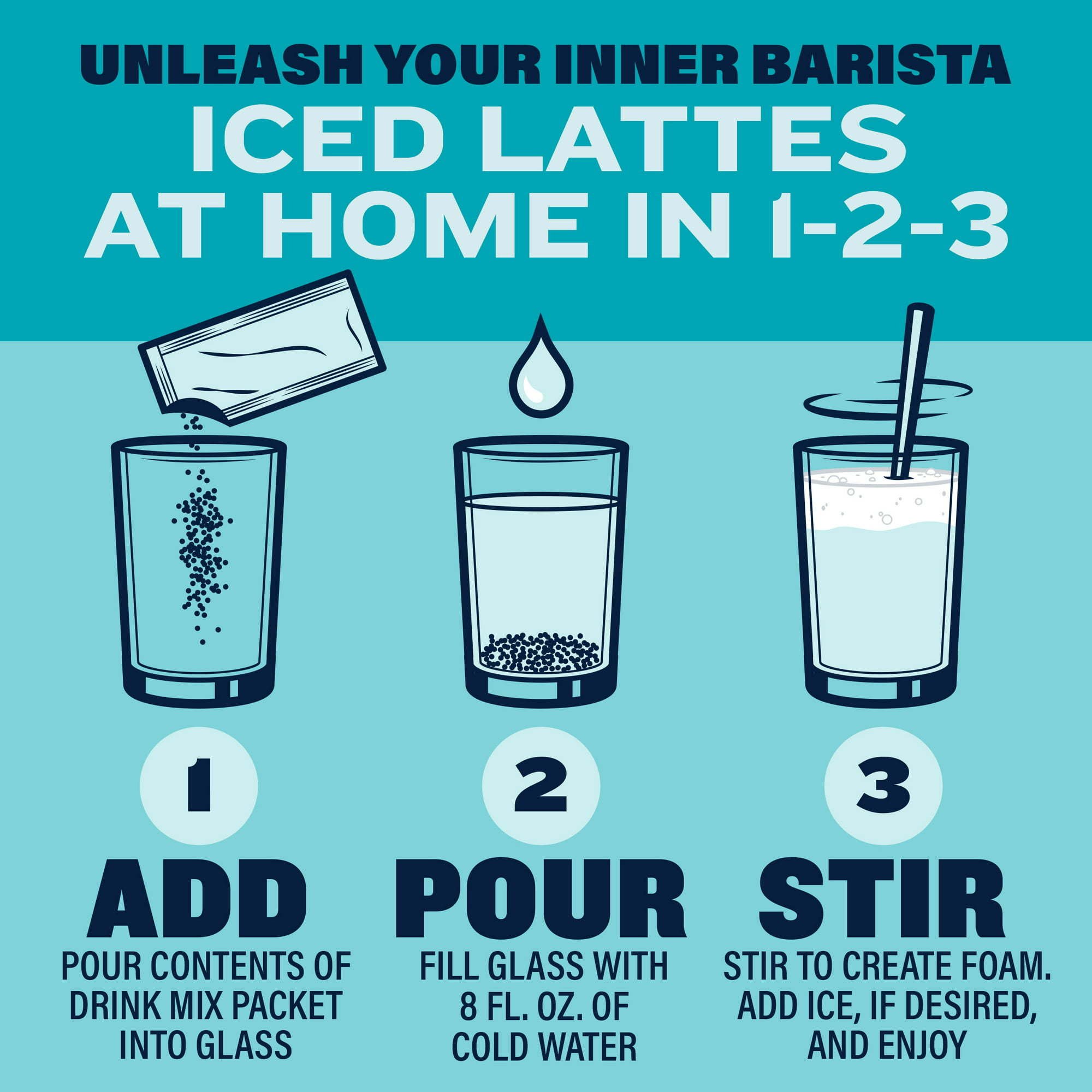 To prepare, pour the contents of the iced latte instant coffee mix packet into a glass, fill the glass with 8 ounces of cold water, then stir to create foam and enjoy; add ice last, if desired