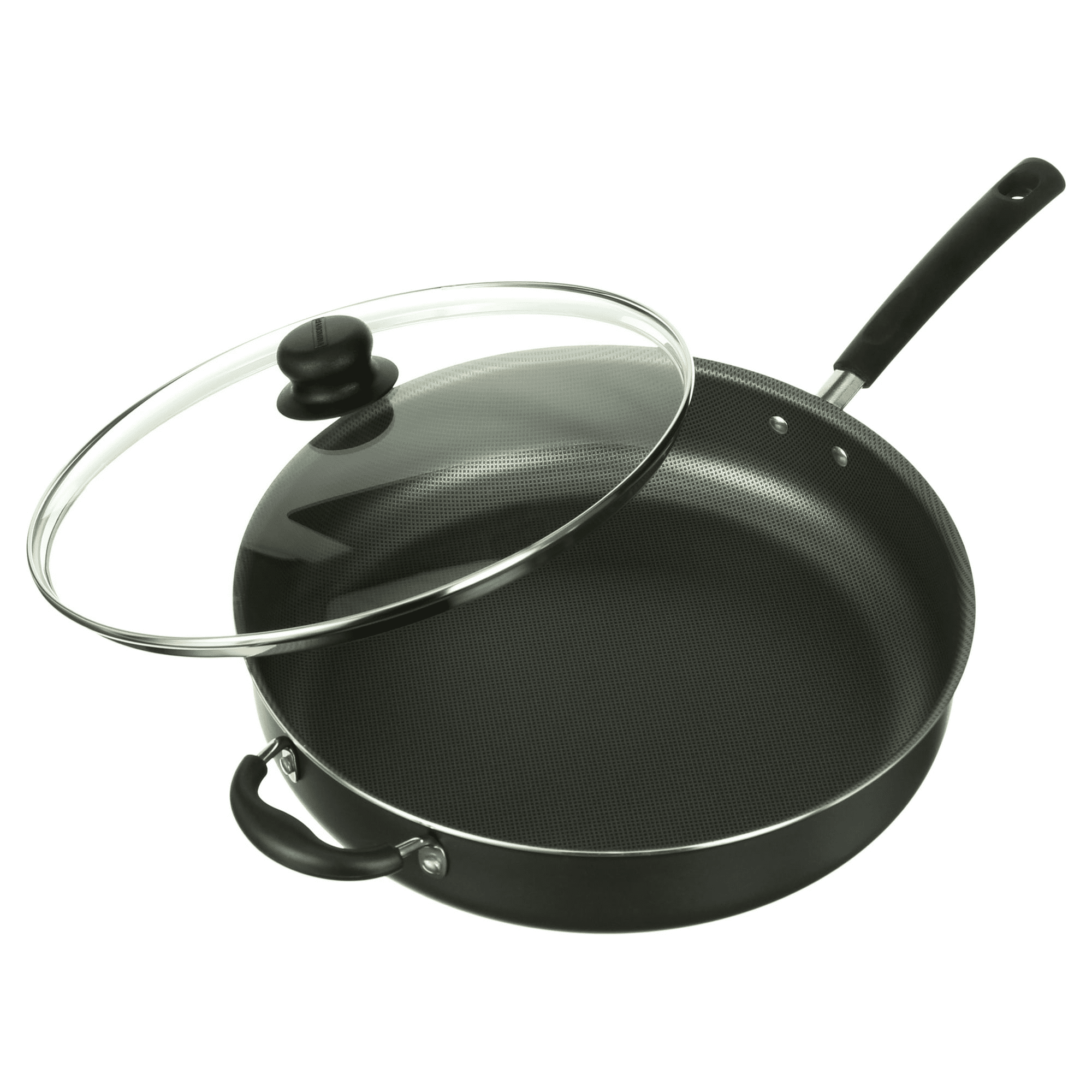 Generous capacity and cooking surface for preparing 1-pot meals and frying foods; Patterned gray interior nonstick coating for easy cooking and cleanup; Riveted, stay-cool handles; Heat- and shatter-resistant tempered glass lid allows easy monitoring of cooking progress; Compatible with electric, gas and ceramic glass cooktops; Dishwasher-safe; Model# 80119/557DS