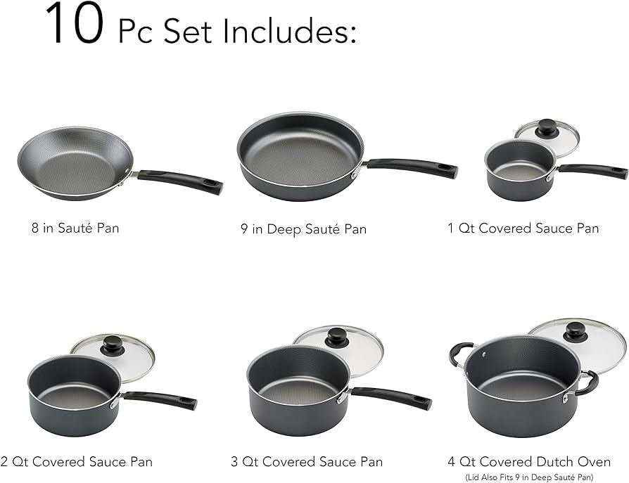 Heat- and shatter-resistant tempered glass lids allow easy monitoring of cooking progress10-piece nonstick cookware set is dishwasher safe